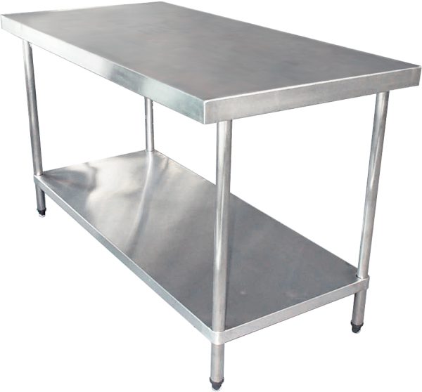 Choose from a huge range of full stainless steel benching. All stainless steel benches come standard with an undershelf for storage. 304 grade full stainless steel top with 2mm galvanised carbon steel reinforcement and 38mm satin polished round stainless steel legs give Kitchen Stainless Steel benches the durability and rigidity under high stress. Available in a variety of sizes from 900mm to 2400mm. These benches do not have splashbacks and make for great island benches that can be accessed from all four sides.